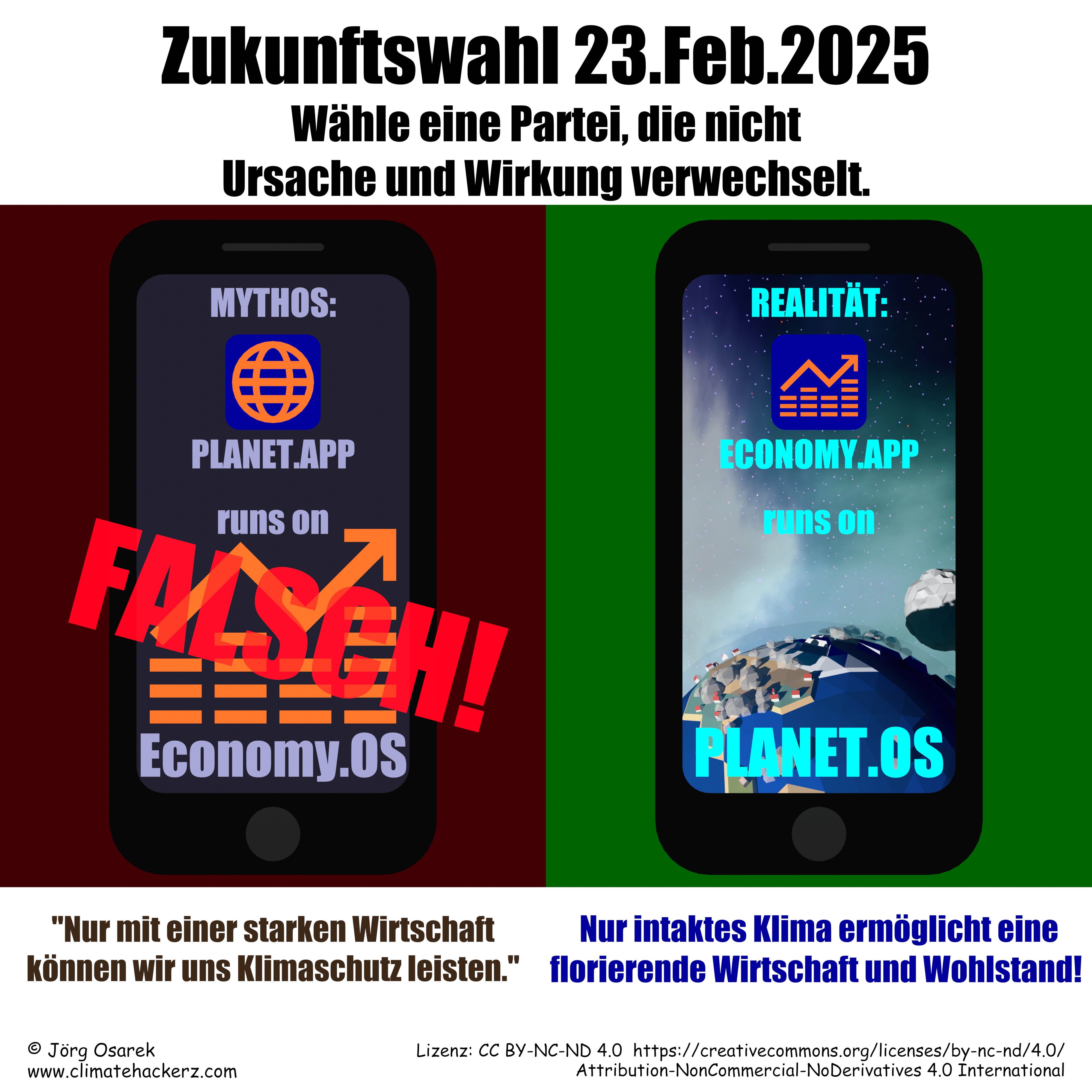 Es gibt Politikeraussagen: "Nur mit einer starken Wirtschaft können wir uns Klimaschutz leisten." Hier wurde Ursache und Wirkung verwechselt. Die Erde mit ihren Planetaren Lebenserhaltungssystemen läuft nicht auf der Wirtschaft und ist von ihr abhängig. Sondern die Wirtschaft braucht den Planeten, seine Ressourcen, seine Regenerationsfähigkeit und ein stabiles Klima, um gedeihen zu können. Zitat vom Climate Transformation Summit 2024 in Berlin zu einer Aussage der Versicherungsindustrie: Eine +3 Grad Welt ist nicht versicherbar. Jedes Jahr werden die Schäden durch Extremwetter und klimaabhängige Ereignisse größer. Stabile Verhältnisse für eine florierende Weltwirtschaft sind nur möglich, wenn wir die planetaren Lebenserhaltungssysteme bewahren können, um so eine Plattform für unsere Zivilisation und unsere Wirtschaft zu haben.
