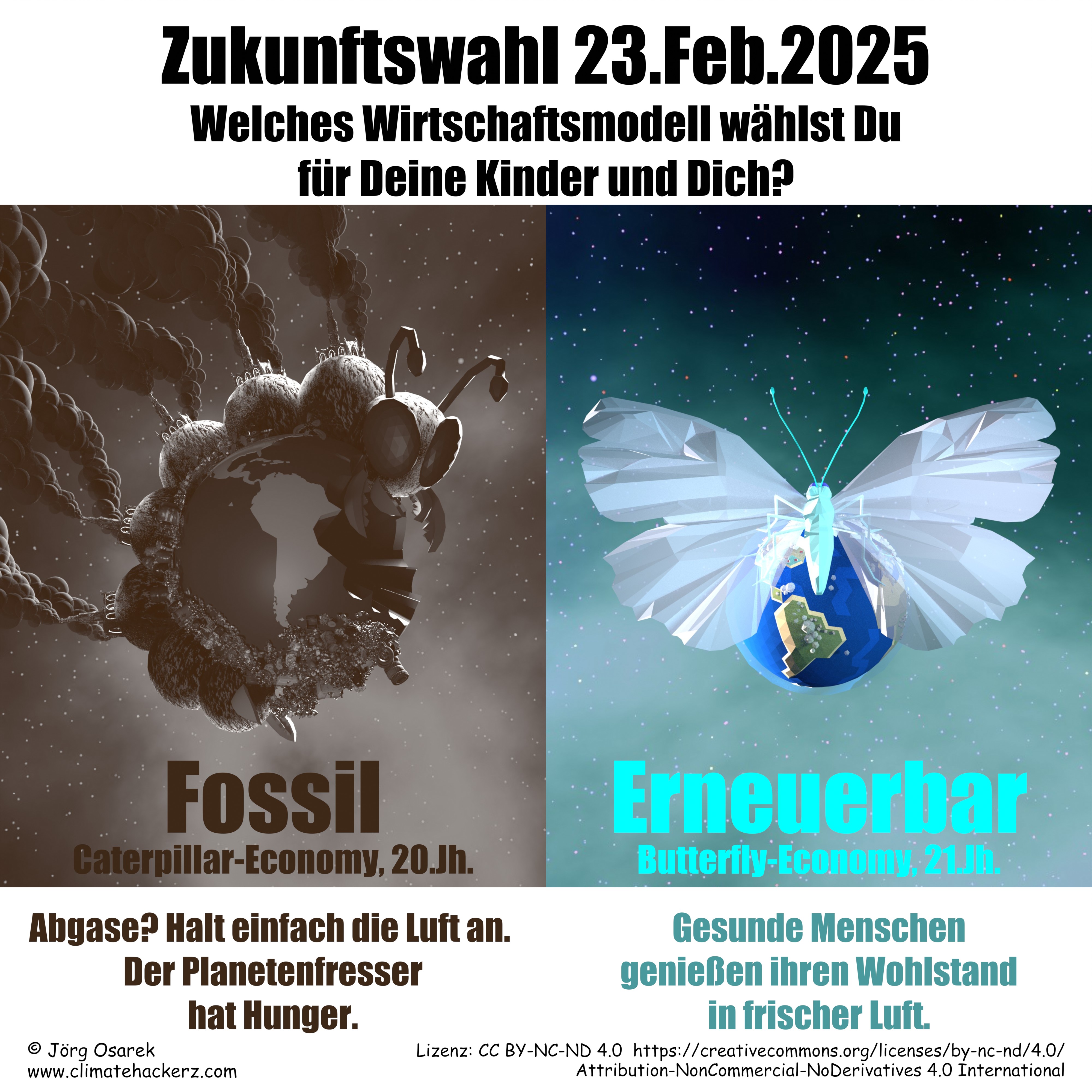 All diejenigen, die in der Fossilen Wirtschaft ein Zukunftsmodell sehen, scheinen die Implikation nicht begriffen zu haben. Die Caterpillar-Economy (Raupen-Wirtschaft - siehe Doughnut Economics von Kate Raworth) frisst den Planeten auf, wir verbrauchen mehr, als wir regenerieren und bringen die Planetaren Lebenserhaltungssysteme über Schwellen und Kipp-Punkte. Das ist der sichere Weg, die Weltwirtschaft zu zerstören und unsere Zivilisation zu ruinieren und Milliarden Klimaflüchtlinge sowie einen potentiellen dritten Weltkrieg in Kauf zu nehmen. Ich glaube, so klar muss es einmal gesagt werden.